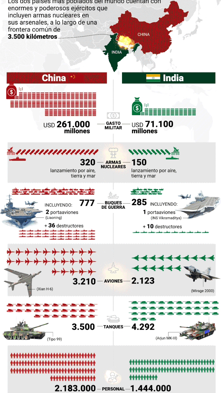 Además de ser los dos países más habitados del mundo, con poblaciones estimadas en 1.400 millones para China y 1350 millones para India, sus ejércitos son también los más grandes del planeta en término de soldados.