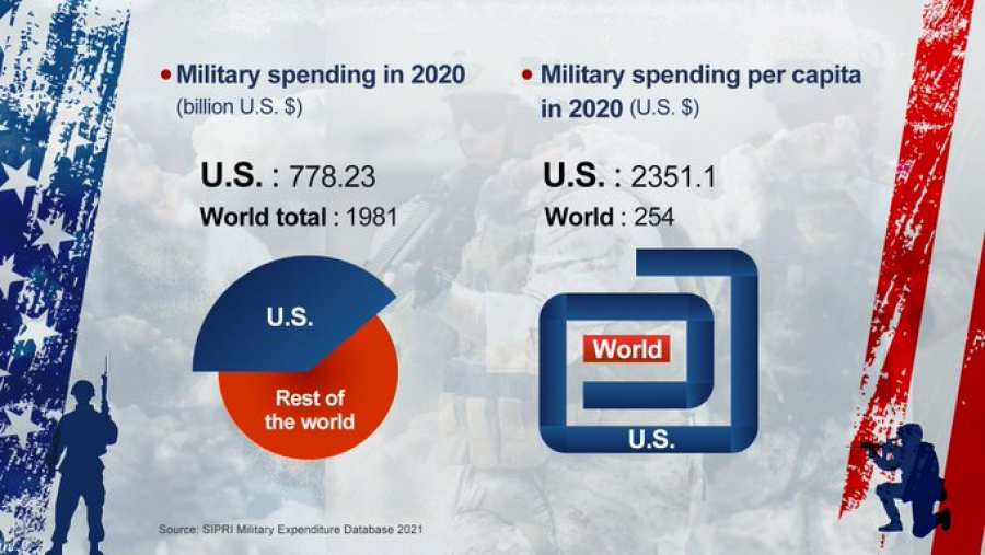 De acuerdo a los datos proporcionados por el vocero, el gasto militar de EE.UU. en el 2020 fue de 778.230 millones de dólares, mientras el resto de los países invirtieron en conjunto 1.202.770 millones de dólares, lo que supone un gasto militar total de 1.981.000 millones en todo el planeta.