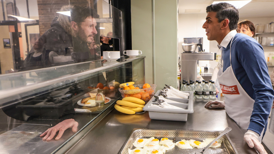 El primer ministro del Reino Unido, Rishi Sunak, visitó este viernes un refugio para personas sin hogar en Londres, donde ayudó a servir el desayuno a sus usuarios.