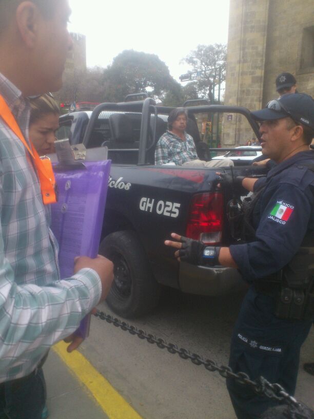 pero de forma casi inmediata le llegaron dos camionetas con doce policías, una de ellas con el número GH-025 y la otra con el número G4061, acompañados de inspectores de Inspección y Reglamentos de Guadalajara, y ahí comenzó su viacrucis, el resultado fue que le tronaron el globo inflable y lo llevaron detenido a los Juzgados Municipales de Guadalajara por vender globos artesanales en la Plaza.
