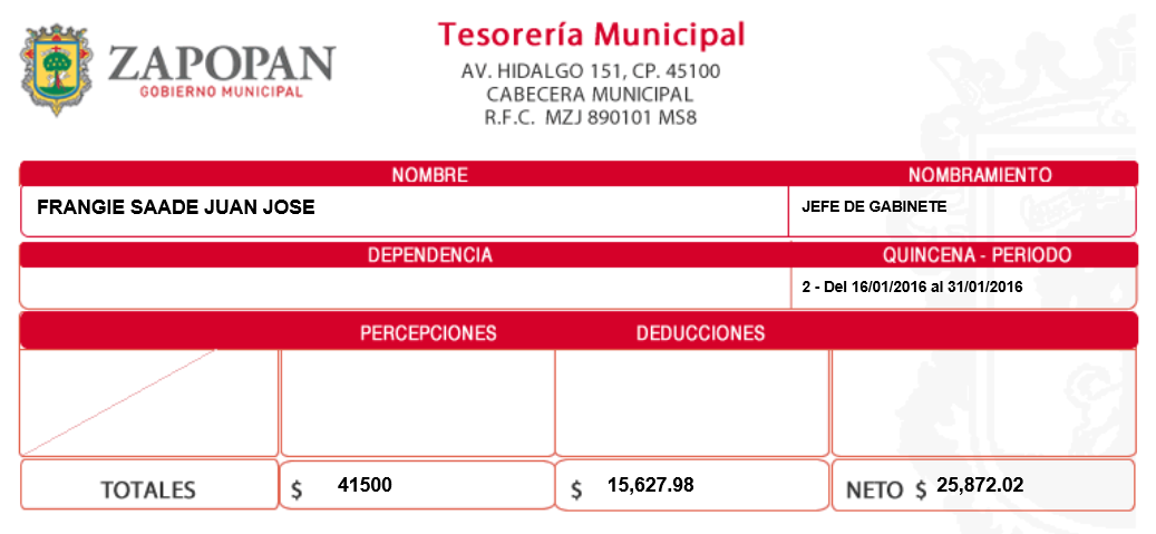 Recibo de Quincena por $41,500.00 pesos del dueño de la cantina en Plaza Guadalajara, Juan Manuel Frangie Saade, y tolerancia influyente con su cantina por parte de Enrique Alfaro Ramírez, en cambio a un humilde comerciante ambulante como Eugenio Marín, cárcel por vender globos en la Plaza Guadalajara.