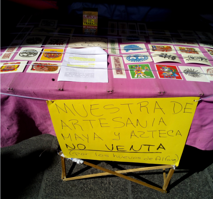 Sandra Espinoza exhibe su artesanía de reproducción hecha a mano de códices aztecas y mayas, tiene 90 días en plantón a un lado de la puerta de ingreso del palacio municipal de Guadalajara, porque Enrique Alfaro le quitó su autorización para vender sus artesanías, y junto a sus artesanías exhibe la suspensión definitiva que le dio un Juez de Distrito para que el presidente municipal de Guadalajara, Enrique Alfaro Ramírez no la desposea de sus artesanías.