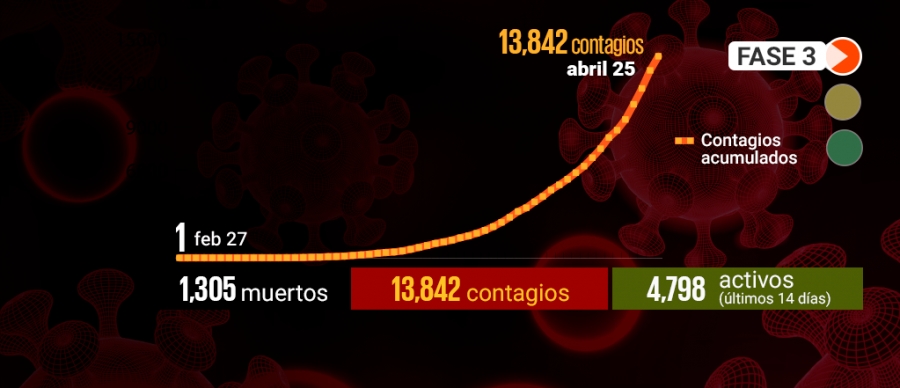 Hasta este viernes, la Secretaría de Salud había confirmado 12 mil 872 contagios, mil 221 muertos y 4 mil 502 casos activos por Covid-19 en México.