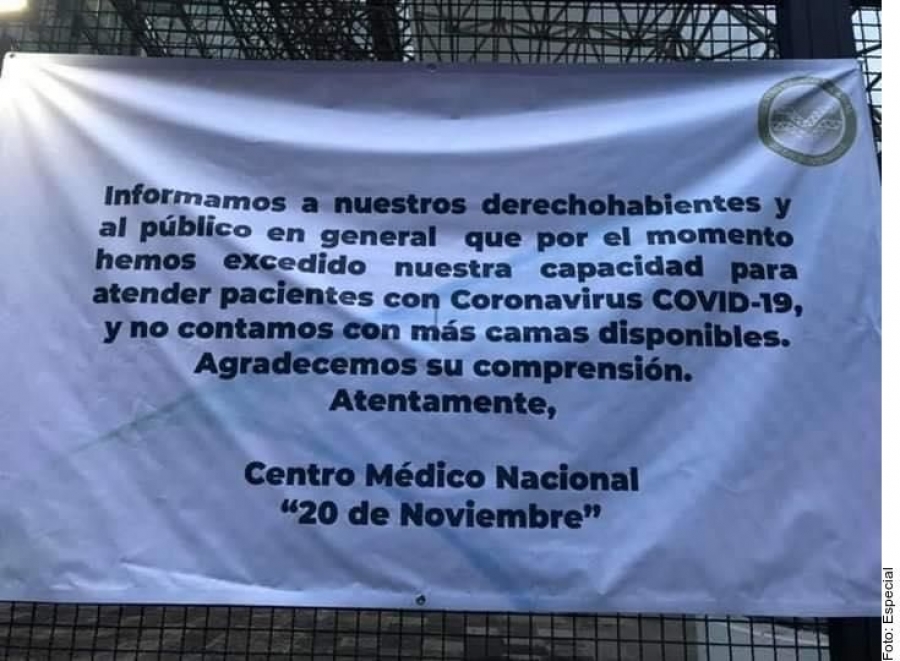 “Informamos a nuestros derechohabientes y al público en general que por el momento hemos excedido nuestra capacidad para atender a pacientes con Coronavirus COVID-19, y no contamos con más camas disponibles. Agradecemos su comprensión”, se lee en una manta.