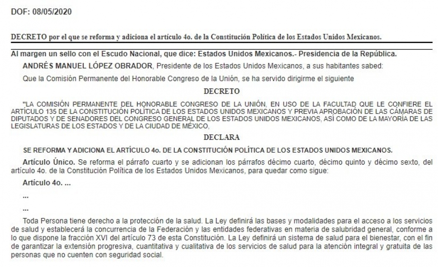 “La Ley definirá un sistema de salud para el bienestar, con el fin de garantizar la extensión progresiva, cuantitativa y cualitativa de los servicios de salud para la atención integral y gratuita de las personas que no cuenten con seguridad social”.