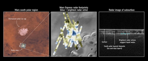 Los investigadores analizaron los datos recopilados entre 2012 y 2015 por el instrumento MARSIS, instalado a bordo de la Mars Express. Las mediciones muestran que las ondas de radar penetraron en el hielo en el polo sur, pero se reflejaron en un cuerpo de agua que yacía debajo. De hecho, el perfil dibujado por el radar es muy parecido al de los grandes lagos de agua líquida hallados bajo la Antártida y Groenlandia.