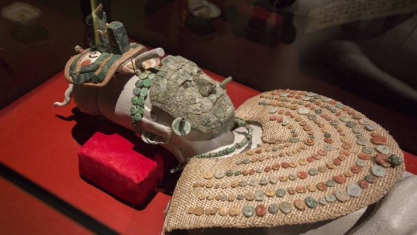 La madrugada del 1 de junio de 1994, el arqueólogo Arnulfo González fue el primero en mirar por un orificio el interior del sarcófago de la Reina Roja. “¡Está llena de jade! ¡Es el alucine, del alucine, del alucine!”, gritaba el arqueólogo mexicano frente a las cámaras que captaron el momento. Decenas de huesos rodeados de miles de piedras de jadeíta y conchas de mar, todo cubierto por polvo de cinabrio, un mineral tóxico de color rojo, por el que el descubrimiento ha sido conocido desde entonces como la Reina Roja. Armar el rompecabezas de la tumba hallada en el Templo XIII de Palenque ha llevado 24 años. Primero, el restaurador Juan Alfonso Cruz consiguió armar la máscara de malaquita. Después, el especialista Constantino Armendáriz reconstruyó el pectoral, la diadema y el tocado del ajuar.