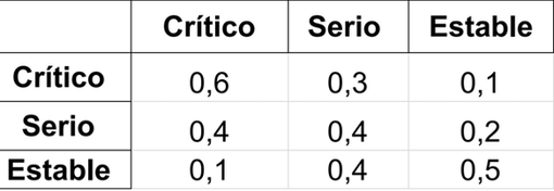 El siguiente es un ejemplo muy sencillo. En una unidad de cuidados intensivos, los pacientes se clasifican (triage) atendiendo a su estado: crítico, serio y estable. Cada día se actualizan las clasificaciones de acuerdo con la evolución histórica de los pacientes admitidos en la unidad hasta ese momento, de modo que las frecuencias relativas de cambios de estado de un paciente son: