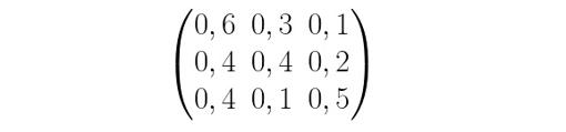 En la disposición anterior, las entradas por filas están asociadas al estado del paciente en el día n y las columnas se refieren a su estado en el día n+1. Entonces, podríamos tomar como matriz de transición en una etapa: