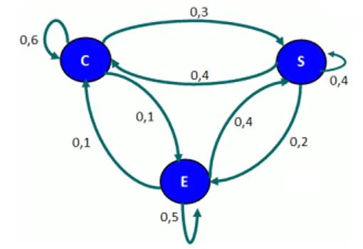 Con un gráfico como este podemos calcular probabilidades en más de una etapa. Por ejemplo, la probabilidad de pasar del estado crítico C a estable E en dos días. Hay tres posibles caminos, dependiendo del estado C, S y E del paciente después del primer día: