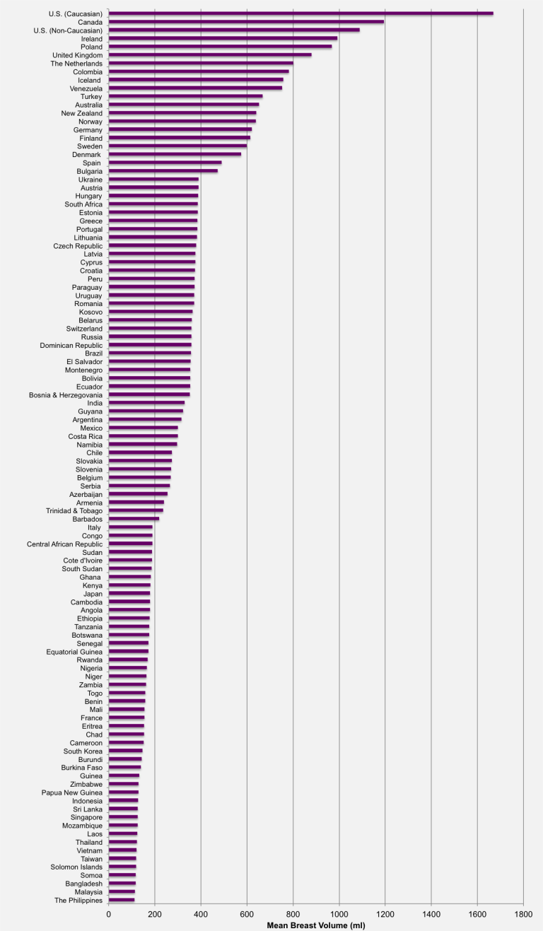 Se dio a conocer que las norteamericanas tienen una talla de copa 'D' —según el sistema métrico estadounidense—. Y, al contrario, las chicas africanas y asiáticas tienen un promedio de copa 'A,' o incluso menos.