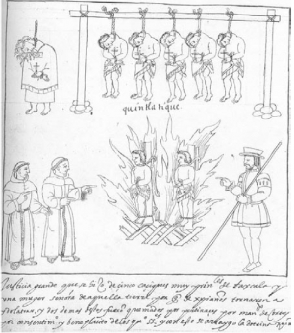 Después de que un cacique entregara 9.000 castellanos (moneda castellana de oro de la época), "no contentos con esto prendieron al dicho señor y átalo a un palo sentado en el suelo, y entendidos los pies pósenle fuego a ellos porque diese más oro y él envió a su casa y trajeron otros tres mil castellanos. Tórnanle a dar tomentos, y él, no dando más oro porque no lo tenía, o porque no lo quería dar, tuviéronle de aquella manera hasta que los tuétanos le salieron por las plantas y así murió".
