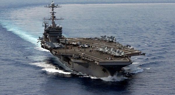 Se puede ver la cubierta del portaviones de la Armada de EE UU, que alberga varias docenas de bombarderos F-18, helicópteros y dos aviones de detección de radar E-2C de largo alcance.