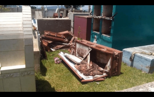 En el camposanto localizaron cuatro tumbas abiertas y cinco más con distintos daños al tratar de ser abiertas sin éxito. Afuera de las tumbas abiertas hallaron cuatro ataúdes, los cuales contenían los cuerpos decapitados de sus dueños.