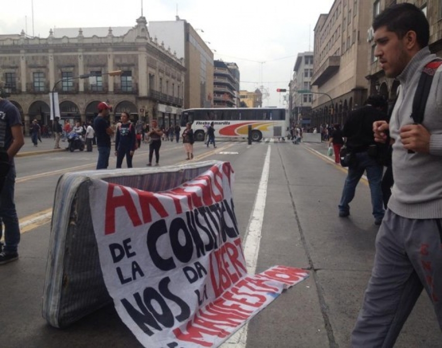 Luego minutos antes de la 1 de la tarde, los normalistas instalaron un plantón en la avenida Alcalde, entre Hidalgo y Juárez, por lo que atravesaron los dos autobuses en los que viajaban para evitar el paso de vehículos.