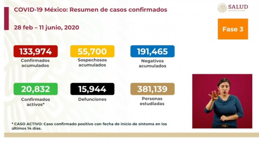 Durante la conferencia vespertina en Palacio Nacional, José Luis Alomía, director de Epidemiología de la Secretaría de Salud (Ssa), informó de 587 nuevos decesos confirmados en las últimas 24 horas, con lo que la cifra global llegó a 15 mil 944 . Hasta ahora, 381 mil 139 personas han sido estudiadas, de las cuales 191 mil 465 tuvieron un resultado negativo para el virus SARS-CoV-2.
